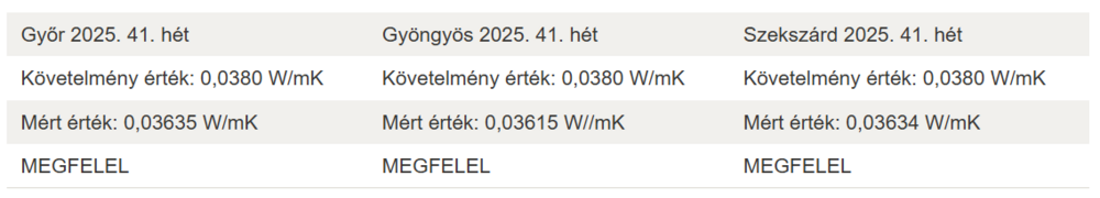 A mérési jegyzőkönyv belső információs anyag, ezért sok minden nem szerepel rajta, ami munkatársaink szaktudásából magától adódik. Így például nincs feltüntetve, hogy a homlokzati hőszigetelő anyagok hővezetési tényezőjének 0,039 W/mK értéket adunk meg. Egy hőszigetelő anyag annál jobb, minél alacsonyabb a hővezetési tényezője. Ezért ha a mért érték (pl. 0,0374 W/mK) a közölt érték alatt van, úgy a termék megfelelő, míg a magasabb értékek nem feleltek meg a próbán.