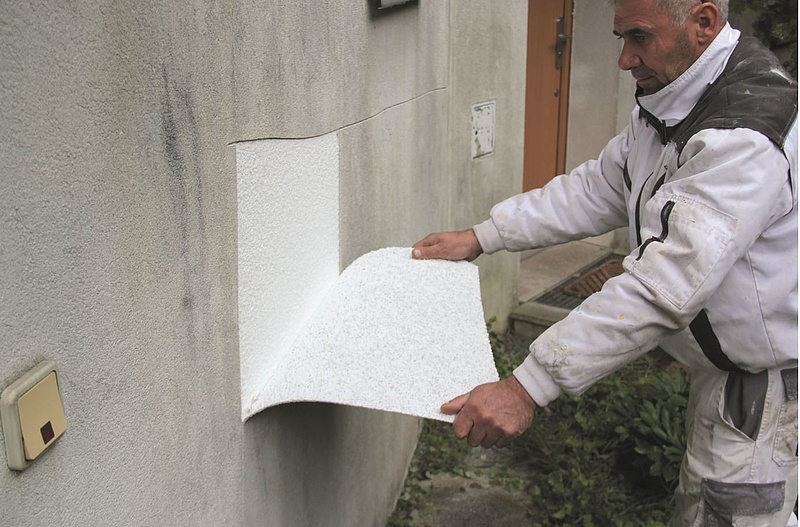 A szigetelés a felső-ausztriai Micheldorfban annyira rossz állapotban volt, hogy a teljesen el kellett távolítani. A ragasztó és a vakolat teljesen levált az alapvakolatról, az öt centiméter vastag lemezeket csak a dübelek tartották a helyén, a felület már nem volt stabil. Betonkaparóval [KS3] [KA4] és bontókalapáccsal összesen 50 tonna vakolatot sikerült eltávolítani a 700 négyzetméteres homlokzatról.